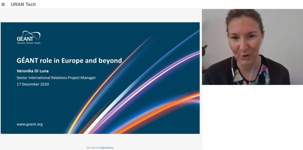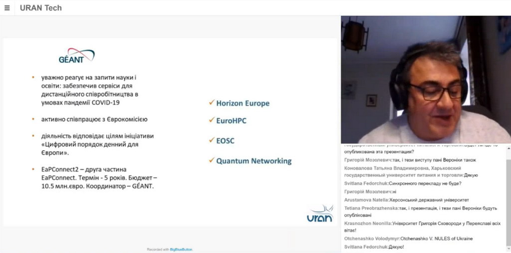 Кількість учасників: 120. Доповідачі: Артур Селецький, заступник міністра освіти і науки України. Привітальне слово. Veronika Di Luna, Senior International Relations Project Manager at GÉANT. GÉANT role in Europe and beyond. Євген Преображенський, виконавчий директор Асоціації УРАН. Організація, структура, принципи управління, технічна база та здобутки УРАН. Відео (.mp4, 56 хв., 124 МБ) або https://youtu.be/fQQYSyq93_Q