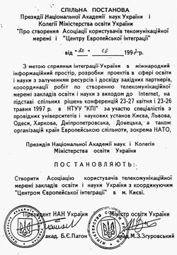 З метою сприяння інтеграції України в міжнародний інформаційний простір, розробки проектів в сфері освіти и науки з залученням ресурсів і досвіду західних партнерів, координації робіт по створенню телекомунікаційної мережі закладів освіти і науки з виходом до Internet , на підставі спільних рішень конференцій 23-27 квітня і 23-26 травня 1997р. в НТУУ «КПІ» за участю спеціалістів з провідних університетів і наукових установ Києва, Львова, Одеси, Харкова, Дніпропетровська, Донецька, а також організацій країн Європейської спільноти, зокрема НАТО,
